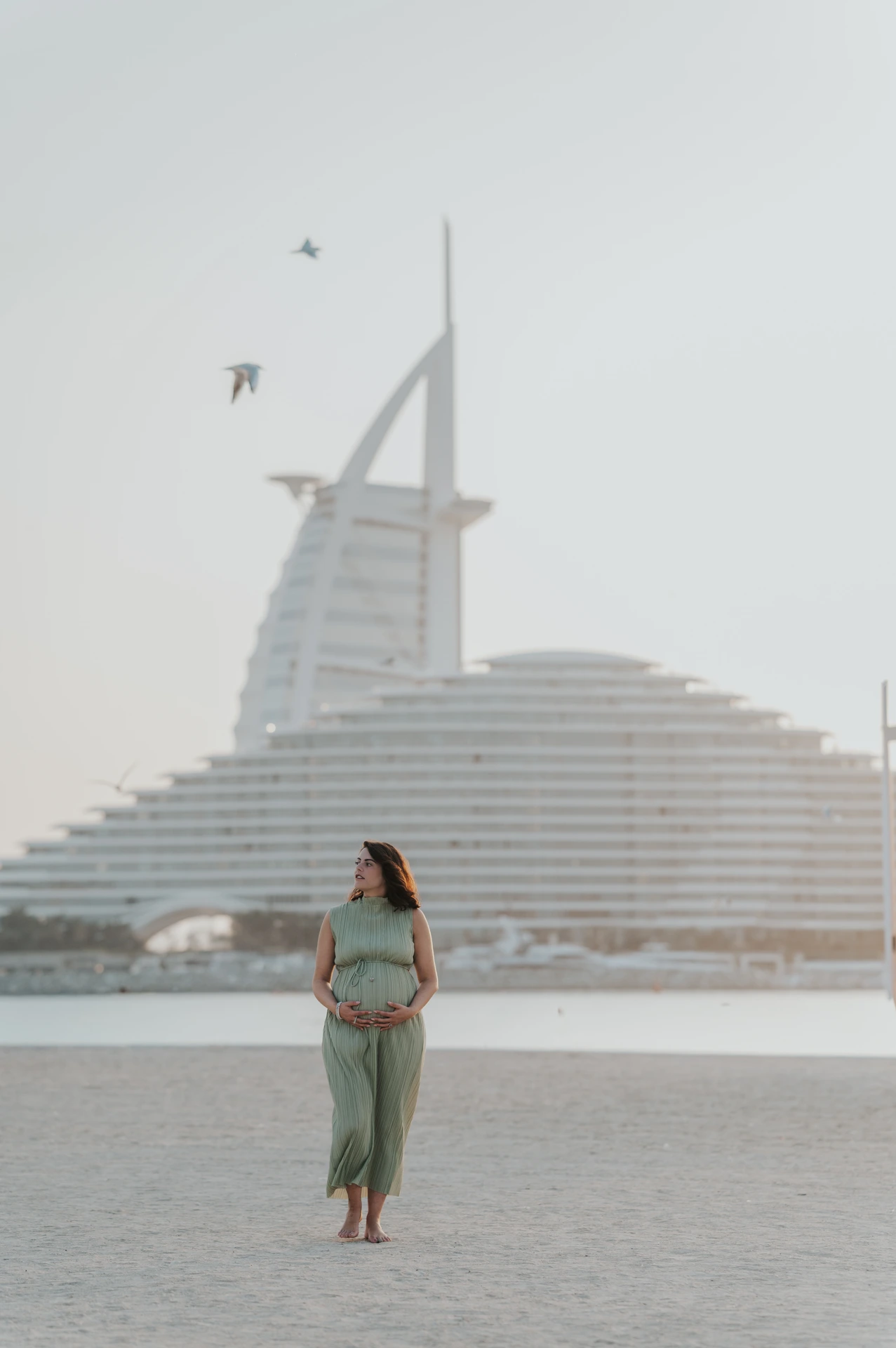 The light here at sunrise and sunset is warm and luminous in a way that wraps around the bump beautifully, and the backdrops range from the iconic, the Burj Al Arab silhouette against a pink sky, to the quietly stunning, a long stretch of calm water with nothing but horizon. Whatever kind of images you’re imagining, Dubai’s beaches can give you that.