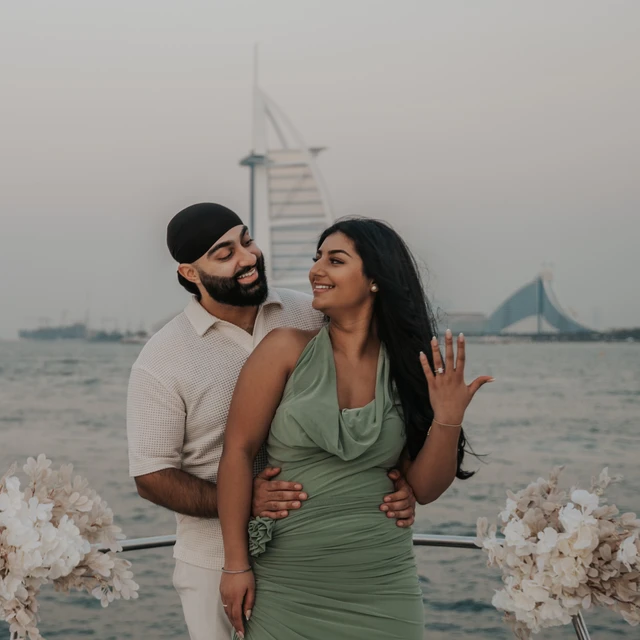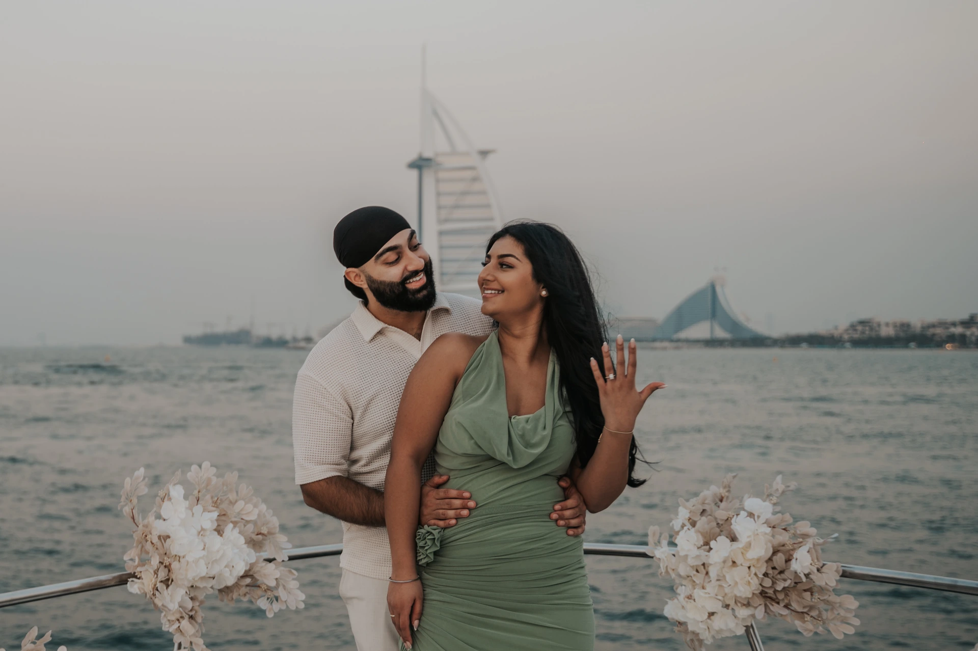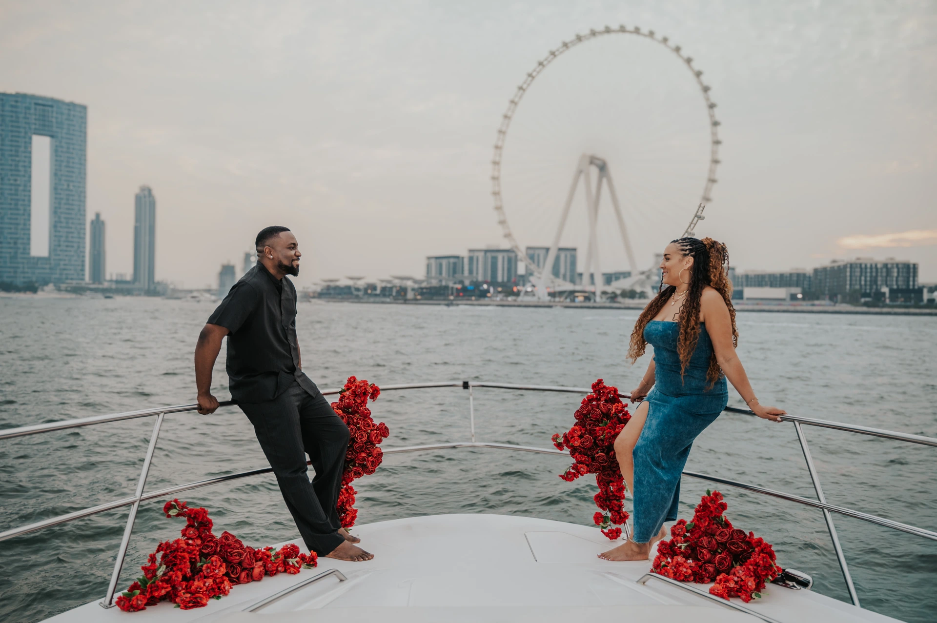 Yes, a few - even on a private yacht. Dubai is quite modern, but it’s still good to be respectful. A warm hug, a kiss and celebrating your Dubai yacht proposal are absolutely fine, but very intense public displays of affection are best kept private. Dress codes are relaxed on yachts, but many couples still like to keep outfits stylish and tasteful. Your Dubai proposal photographer is used to working with international couples and cultures and will gently guide you so everything feels natural and respectful.