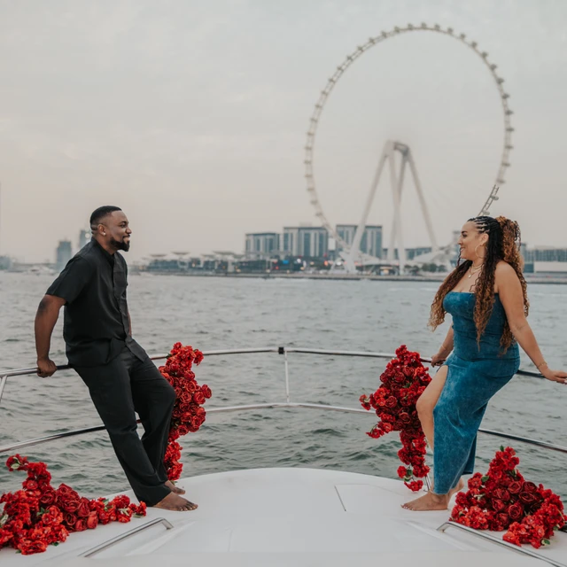 One of the biggest reasons people choose a Dubai yacht proposal is the variety of skyline views they get in a single trip. The yacht can glide past Dubai Marina’s high-rises, turn towards JBR and the Ain Dubai wheel, or position itself so the city looks like a glittering wall of light behind the couple. From the front of the yacht, every direction offers a different mood: playful and beachy near JBR, dramatic and urban near the marina, or more open and serene further out on the water. A Dubai proposal photographer who specialises in yacht proposals knows exactly when to ask the captain to pause or slow down for a shot. They’ll anticipate the moment when the light, the angle and the view all come together so that when the question is asked, the background is just as impressive as the moment itself.